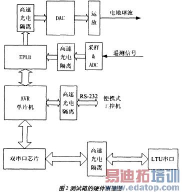 测试箱的硬件原理如图2所示。测试系统以AVR单片机为核心,外围电路由串口通信、ADC采样和DAC输出等部分构成。
