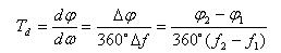 通信工程中常用来描述信号相位失真的参量--群时延(也称为包络时延)的定义为:网络的特征相移对频率变化曲线的斜率。当网络的相频特性为直线时,群时延Td为常数,通过网络各种频率的信号受到同样的延时,结果便不 会产生相位失真和调幅波的包络失真。当相频特性为非线性时Td便不为常数。欲求某个频率f上的群时延,只要在测试频率两边取f1和f2两点的频率和相位数据,便可求得群时延。也就是从物理意义上说,某一频率的群时延表示以该频率为中心的一个很窄频带内信号通过系统或网络的传输时间,在数值上等于相频特性的一阶微分,其通用表达式为:![]()