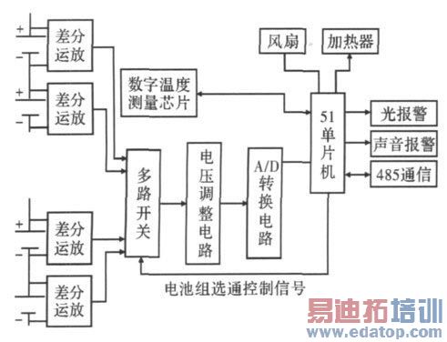 具有高电压、高容量、循环寿命长、安全性能好等优点的锂离子电池,在便携式电子设备、电动汽车、空间技术、国防工业等多方面具有广阔的应用前景。由若干节锂离子电池经串联组成的动力锂离子电池组目前应用最为广泛。由于每节单体电池的电压不一致,使用中电池不允许过充电、过放电,电池的性能和寿命受温度影响较大等特点,必须对串联锂离子电池组进行监测,确保在使用中锂离子电池具有良好的状态,或者使用中电池出现问题立即报警,电源管理系统立即采取保障措施,并提醒相关人员检修。单体电压和电池组的温度是辨别串联锂离子电池组是否正常工作的主要技术指标。文献[1]采用直接采样法,将要测量的单体电池电压存储在非电容上进行测量。该方法反应时间慢、误差较大、控制复杂; 文献[2]采用运放和光藕继电器来测量串联电池组的单体电压。该方法对光耦的线性度要求很高,导致硬件成本较高。目前,直接采用集成芯片的串联锂离子电池组监控系统受到青睐,但该方法串联电池的数目固定,导致应用不灵活、硬件成本高等缺点。文中研制了一种动力锂离子电池组监测系统,对串联锂离子电池组的单体电压和电池组的温度进行在线监测,当单体电池电压偏离规定区间时,监测系统启动报警程序进行声、光报警; 当电池组温度偏离规定的区间时,监测系统启动风扇或加热控制电路,并存储有关数据,确保电池组正常工作。整个监测系统具有连续测量分量、简单经济、精度高和可靠性高的特点。