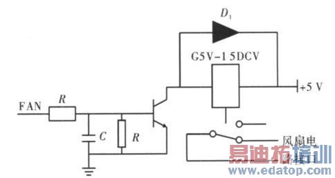 电路如图6 所示,FAN 为低电平时,晶体管9014 不导通,此时继电器无动作; 当FAN 为高电平时,晶体管9014 导通,使得继电器触点吸合,风扇在24 V 电源电压的供电下开始工作。