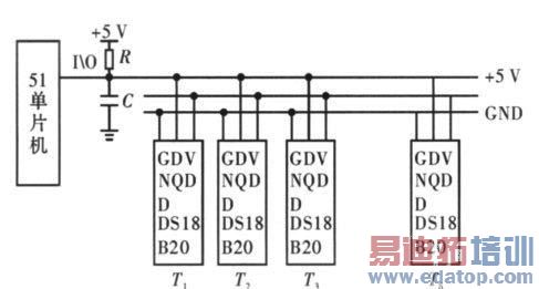 针对串联电池组,传统的测温方法多采用模拟温度传感器进行测量,在数据的采集和传输过程中易受外界环境的干扰,从而使测得的结果误差较大,且当测量点较多时,连线较复杂。文中采用单片机和单总线数字式温度传感器DS18B20 来解决上述问题[5].其原理如图5 所示。