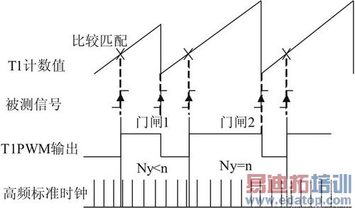 在对被测信号频率和周期的测量中,等精度测量是基于DSP比较匹配时T1PWM引脚输出电平的跳变作为门闸信号的开启和关闭,由于比较匹配发生在被测信号的上升沿,从而实现了门闸时间与被测信号的同步。原理图如图3所示。