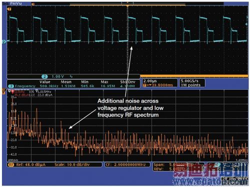 在电源驱动RF电路板时,噪声功率的时域画面和频域画面变化。图6显示了相同的电源噪声及额外的信号。注意二阶谐波下降,但有许多其它低电平噪声。部分噪声可能会给无线电接收机的运行带来很大干扰,需要认真评估。