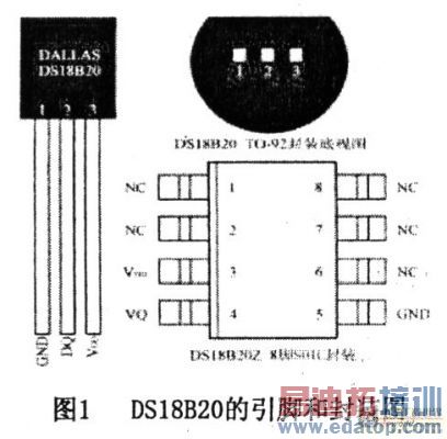 DS18820数字温度计是DALEAS公司生产的1一Wire,即单总线器件,属于新一代适配微处理器的智能数字温度传感器。将温度感测、信号变换、A/D转换和加热功能集成到一个芯片上,采用T0—92封装,接口非常简单。其引脚和封装如图1所示,DQ为数字信号输入/输出端;GND为电源地;VDD为外接供电电源输入端(在寄生电源接线方式时接地)。