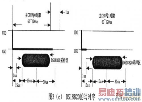 对于DSl8820写0时序和写1时序的要求不同,当要写O时序时,单总线要被拉低至~>60us,保证DSl8820能够在15us到45us之间能够正确地采样IO总线上的“O”电平,当要写l时序时,单总线被拉低之后,在15us之内就得释放单总线。