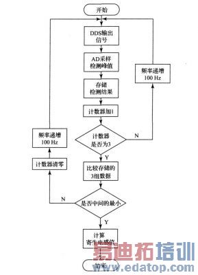 单片机采用Atmeg16, 分别控制DDS 和AD 转换器,同时负责对计算结果进行分析。单片机每次控制DDS输出1 个信号,同时采集这个信号经过待测电路后的响应结果,这样的动作每重复3 次就进行一次比较,因为谐振点的电平是最低的,因此如果采集的3 次数据中的中间一次数值最小,则该数值就是谐振点处的电平值,记下此时的频率f , 利用式(1) 可知: