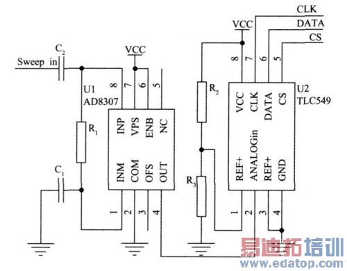 由于该检测电路只是检测出谐振点,即图2 中的最低点, 只是一个比较关系, 并未对检测到的最低点的电平精度有很高要求, 因此对采样电路的精度要求不高,又因为对数检波器的输出是直流信号, 所以常见的大多数低速AD 转换器都可以满足要求。这里采用串行8 位的AD 转换器TLC549。TL549 采用三线制串行控制方法, 很方便与单片机控制器接口。该检测电路的原理图如图5 所示。