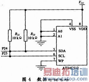 E2PROM是数据存储电路的关键器件,本文选用Atmel公司新近推出的具有I2C总线容量达512 Kb(64 K×8 b)的AT24C512。该芯片的主要特性如下:存储容量为65 536 B;与100 kHz,400 kHz,1 MHzI2C总线兼容;100 000次编程/擦写周期;单电源、读/写电压为1.8~5.5 V;ESD保护电压大于4 kV;写保护功能,当WP为高电平时,进入写保护状态;CMOS低功耗技术,最大写入电流为3 mA;128 B页写入缓存器;自动定时的写周期。SDA线和SCL分别与单片机的P2.4和P2.5口相连。数据存储电路如图4所示。