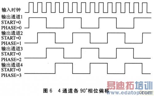 将每个通道的输出设置为4分频和50%占空比。把通道1设置为低电平起始,0输入时钟延时;把输出通道2设置为低电平起始,1个输入时钟延时;把输出通道3设置为低电平起始,2个输入时钟延时;把输出通道4设置为低电平起始,3个输入时钟延时。这样就实现了图6中相位相差90°的4通道输出。通过时钟芯片配置产生相差90°的采样时钟提供给4片采样芯片AD9481,可以使总的采样率达到1 Gsps的水平。