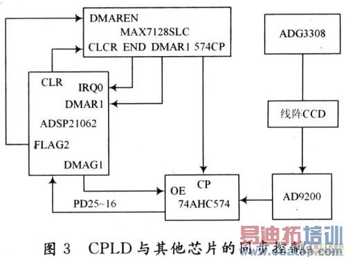 CPLD选用可编程逻辑器件MAX7128SLC-84,DSP选用ADI公司的ADSP21062。MAX7128SLC-84可以将I/O设置在3.3 V或5 V下工作。因为系统中DSP,AD9200的工作电压均为3.3 V,故CPLD的I/O也设置为3.3 V。然而CCD工作电压为5 V,需要的外部驱动时序脉冲也都为5 V电平模式,而MAX7128SLC-84输出的脉冲信号都为3.3 V,电平不匹配,这里采用ADG3308芯片对MAX7128SLC-84输出的CCD驱动信号作电平转换,使它们从3.3 V变为5 V。MAX7128SLC-84与系统DSP,74AHC574,CCD之间的同步控制如图3所示。