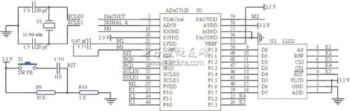 在进行频率转换时,需要一个频率可调的信号源提供参考信号。以ARM7 为内核开发的高性能微处理器ADuC7128 内部集成了一个输出频率可达到25 MHz 的DDS 模块,信号的输出电压在1 V 左右。其技术指标满足了作为参考信号的要求。同时,ADuC7128 可通过内部PLL 进行时钟倍频,最高工作频率可达41. 78 MHz,工作电压在图3ADuC7128控制电路3. 0 ~ 3. 6 V 范围内。ADuC7128 微处理器自身结构紧凑、体积小,能够有效提高系统的集成度和可靠性。ADuC7128 微处理器的控制电路,如图3 所示。
