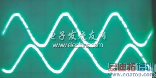 两路同频输入信号是由一个相位差可调节的高精度信号源产生。当输入信号频率小于30 kHz时,由ADuC7128 内部计数器直接计数,经过数据处理后得出相位差。输入信号在进行过零比较时,由于两路输入信号之间的电平不相等所引起的幅相误差,使得整形后产生的方波有所失真。图5 是两路输入信号为100 kHz,相位差75°的正弦波信号,经过频率变换及滤波整形后,两个信号的相位保持不变,频率变为30 kHz、幅度线性变化,如图6 所示。