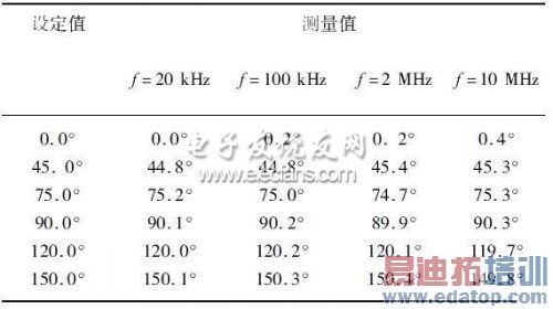 随机抽取四个不同频率的输入信号,分别在相位差为0 ~ 150°的范围内进行测试,测试结果见表1。