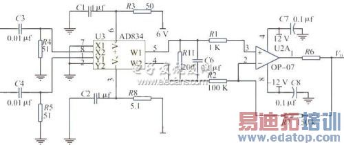 频率变换电路如图2 所示,AD834 的引脚X1和Y2 均与地相连,将待测信号与参考信号分别以单端输入的形式输入到AD834 的两个信号端口Y1、X2。选择Y1、X2 作为单端输入引脚是因为这两个引脚离输出端比较远,选择它们作为输入可以减小输入信号到输出端的耦合分量。根据设计需要,在AD834 后面接入一个具有高开环增益的运算放大器OP-07,通过OP-7 和R7、R6 组成I /V 转换电路,这样就可以将乘法器的输出信号由双端差分电流形式转化为单端电压形式。