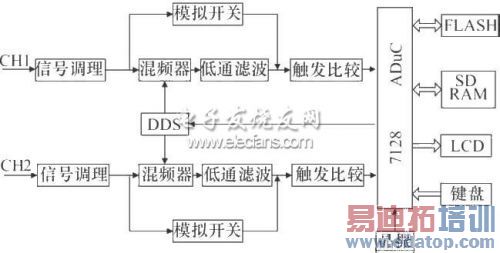 DACOUT 是一个用来设置ADuC7128 内部DDS 输出频率的一个控制信号,在本设计中,当输入信号的频率超过30 kHz 时,ADuC7128 内部DDS 保持产生一个与输入信号频率相差30 kHz 的正弦波信号,作为频率转换的参考信号。