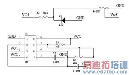 监测细胞膜离子通道电流有电压钳位和电流钳位两种方法,我们采用的是电压钳位的方法,即在I-V 转换器的同相输入端接入一个钳位电压,把细胞膜电位钳制在一个固定的电压值。这个电压的幅值在几十到几百 mV 范围内,脉冲时间10~50ms。图2 给出了钳位电压发生器的电路。电路中采用的是555 构成多谐振荡的方式来实现方波的发生。555 直接产生的方波信号幅值接近电源电压,而所用的钳位电压应该是一个电压幅值在几百个毫伏左右的信号,所以要对555 产生的信号进行幅度的调节。555 产生的方波信号经过电阻R3 和稳压管D1后在D1 两端输出稳定的2.4V 电压,再在这个电压两端并上电位器R4,从它的滑动端取出电压作为钳位电压。这样可以对钳位电压进行灵活的调节,得到需要的幅度。产生的方波的周期可通过调节电位器R2 在14ms~154ms 之间变化。