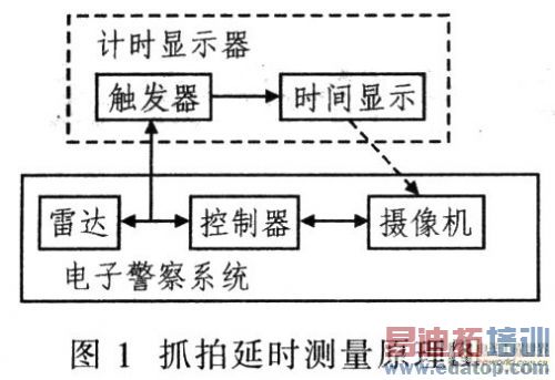图1给出雷达型电子警察抓拍延时测量原理图。其中计时显示器为专门设计的电子装置,它能够从接收到触发信号开始以毫秒为单位计时显示。