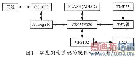 另外,采用Atmegal6相配合的目的是为了提高系统的采集速度,进而提高温度测量的灵敏度。通过CCl000完成短距离无线通信。FLASH芯片可对温度数据进行存储,以在无线通信故障时读取。C8051F020通过CP2102的转换后,可用USB端口与上位机通信。本系统的硬件结构框图如图1所示。