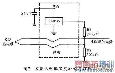 图2所示是一个温度补偿电路的原理图。图中,温度传感器TMP35很好的完成了温度补偿工作,TMP35输出的电压先经电阻分压,再经放大器放大,就是K型热电偶对应的E(t0,O)。