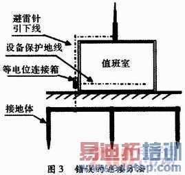 目前,关于共用接地有一种误解,认为将设备的接地引线无论怎样连接,最终只要接在同一个接地体上就算是共用接地,如图3所示。将“共引线”也误认为是“共地”。其实不然,所谓“共用接地”就是把许多不同性质的接地装置如电气安全接地、交流电源工作地、通信及计算机直流地等汇集于一个等电位连接箱,使之成为一个等电位体,然后直接与接地体连接,而防雷地则通过另一条引下线与接地体连接。而不是将室内设备接地与室外防直击雷接地通过同一根引下线与地相连。更不允许将室内接地引线与室外防直击雷引线汇集与一个所谓的等电位连接箱,然后再与接地体相连。室内接地引线要远离室外防雷引下线,如图4所示。否则,遇雷击时,强大的雷电流在通过引线向大地泄放的同时,室内引线及所有设备上瞬间便会产生很高的电位差,设备难免遭到破坏。另外,假设与接地体相连的引线因锈蚀断开或等电位连接端子接触不良,一旦发生雷击,强大的雷电流便会直击至值班室设备上,这是非常危险的。