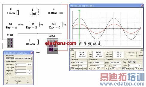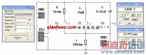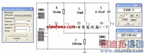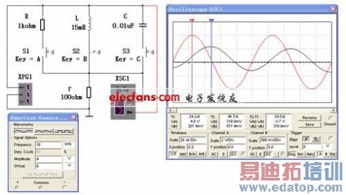 在图7-1的仿真电路中,将开关S3闭合,S1、S2断开,得图7-3所示电路。信号发生器输出幅值为4V的正弦波(Offset=0),并在不同频率时保持不变。分别按给定的频率值输出正弦波, 打开仿真开关。其中, 。
