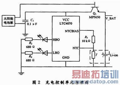 太阳能电池板未对锂电池进行充电时为了减少LTC4070能量消耗添加三极管Q1,当Q1基极电压下降时将LTC4070与锂电池隔离。在正常充电模式下大部分电流通过Q1流向锂电池。当VCC到达ADJ设置的浮点电压时,LTC4070分流Q1中bc结的电流持续的减少电池充电电流直至0,并且Q1进入饱和状态。如果热敏电阻T升高浮点电压降低,LTC4070将分流更多的电流,Q1强制进入反偏状态直到电池电压下降。ADJ引脚用于设置浮点电压,当接至地时为4.0 V,接至VCC时为4.2 V,悬空时为4.1 V。当锂电池电压低于3.2 V时LBO拉高D1点亮,当锂电池充电饱和后,HBO拉高,D2点亮。