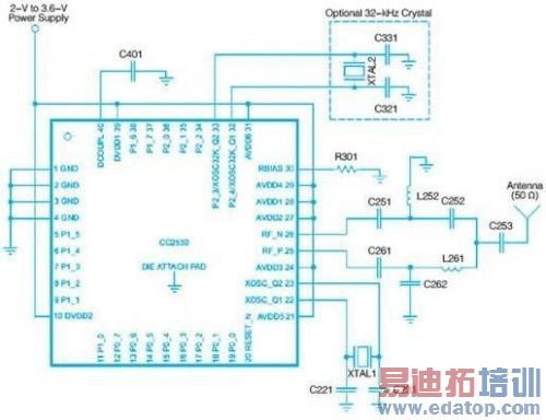 由于cc2530芯片内集成了许多特色功能模块,因此,其典型的外围电路也就非常简洁。其中,主时钟晶振采用32mhz无源晶振以及32.768khz时钟晶振;无线rf模块外围电路采用无巴伦的阻抗匹配网络,天线使用50欧鞭状负极性天线,具体的元器件封装信息参见附表所示。