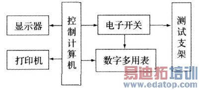 电子开关控制测试支架上的210 个引脚的中断或连通, 以便于每次只测试一个引脚的输出信号。