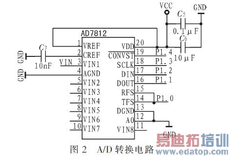 经过温度传感器转换后的输出电压值不能直接送入单片机中进行处理,还必须在它们之间增加A/D转换装置。本文中选择AD7812作为A/D转换器。AD7812是由Analog Devices公司生产的一种串行接口的10位8通道A/D转换器。与一般的并行接口A/D转换器相比,它的优点在于能够节省处理器的引脚资源。节省下来的引脚资源可以进一步的对系统进行扩展,以使其功能更加强大。在AD7812内部有8路模拟开关可以采集8路模拟信号,这里只需要将经放大的传感器输出信号输入到其中任意一路即可,为了简便起见,就取其中的第1路模拟开关作为输入信号的通道。由于 AD7812内部具有转换时钟源,因而不需要外部提供时钟源。单片机只需要通过它的串行时钟输入、数据输出、数据输入、转换输入4根引脚就可以对其进行控制。该部分电路设计如图2所示。