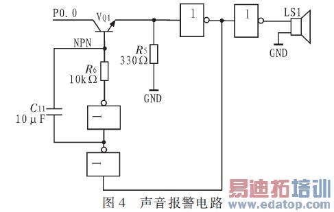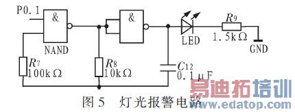 外界环境中的温度被温度传感器所采集,温度传感器会将此时的温度转换成电压值,该电压值经过匹配后送入A/D转换器,经过转换之后的数据送入单片机进行处理。单片机按照编制好的程序进行处理,如果确实此时的温度超过了人们凭借经验设定的阈值,单片机将通过指令使P0.0、P0.1两口输出为高电平(约为+5 V),使得扬声器与发光二极管产生报警信号。该部分的电路设计如图4和图5所示。