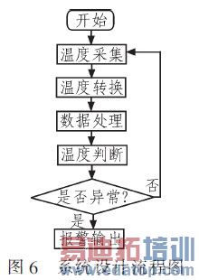 系统的工作流程是:LM35采集温度,并且将温度信号转换成电信号:A/D转换将线性放大后的模拟电信号进行A/D转换,使之成为单片机能够处理的数字信号;单片机通过处理转换后的数字信号来分析采样的温度值,并将分析结果送到报警输出电路中;报警输出电路根据分析的结果做出相应的反应。系统的软件设计流程图如图6所示。