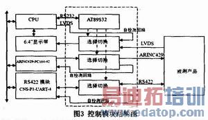 为了满足通用检测平台的自测试需求,通用检测平台设计了控制模块,其主要功能是提供自检测需要的硬件回绕电路。以RS422自检测为例,CNS-P1-UART-4板卡具有4个全双工的RS422通道,其中通道1作为检测电路与被测件的RS422通道相连,通道2作为自检测回路。当通用检测平台进行自检测时,CPU通过RS232接口向控制模块发送指令,控制模块上的切换电路将RS422板卡的通道1和通道2相连,形成测试回路,控制模块采用单片机AT89S32及外围电路实现,模块结构图如图3所示。