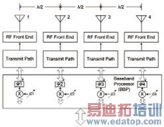 图1中的架构可用于目前的许多应用中,但要充分发挥窄波束系统的优势,必须进行动态波束控制(移动主波束)或波束成形(移动主波束和零陷)。波束控制要求基带处理器(BBP)改变各天线信号的相位,波束成形则要求BBP改变各天线信号的相位和幅度。除非另有说明,本文中的“波束成形”同时包括波束控制和波束成形。图3所示为一个波束成形实现系统。为清楚起见,图中仅显示发射路径。