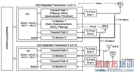 第一个2x2收发器的发射和监控路径使用内部LO。第二个2x2收发器的发射和监控路径使用不同的LO。LO的频率相同,但可能存在相位差,而且每次收发器上电时,该相位差可能发生变化。
