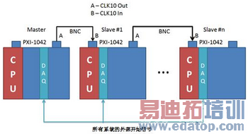 图8 是硬件同步配置的例子。在这个配置中,NI PXI-1042主机箱利用BNC电缆将CLK10作为时钟参考导出到N个其他PXI机箱。所有机箱均导入外部开始信号。您可以阅读高级定时与同步系统设计了解多机箱同步的更多信息。