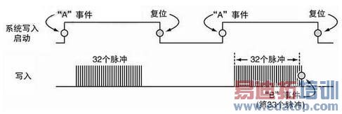 本系统中,读/写电路中的一个单元设计成在每个有效系统写入启动(WE)周期中执行一串32条写入命令。图2描述了较大的周期时间与导致数据写入的各个脉冲的关系。