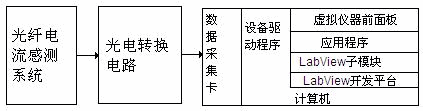 如图1所示是整个硬件系统的方框图。光纤电流感测系统输出的光纤干涉信号经过光电转换电路变成电信号,再由数据采集卡收集信号数据传输到虚拟仪器的软件系统。