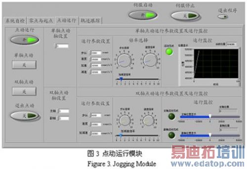 本方案是并联机器人控制系统设计领域中一种新型的系统组建方法,其出发点和落脚点是缩短开发周期、降低系统造价、提高系统特性、完善系统功能。基于LabVIEW和PXI平台的6-DOF并联机器人开放式数字控制系统不需要从最低层进行开发,只需对各个模块进行配置并编写出用户需要的特定功能程序即可,与以往的机器人控制系统的开发相比,不仅大大缩短了开发周期,而且系统的升级和维护也非常方便,在这个意义上来说此系统是性价比最高的。系统特性方面的优势主要体现在稳定性、快速性和精确性上,25KHz—25.6MHz的编码器反馈信号滤波范围使得系统能够在强电干扰的工业现场的稳定工作,6轴PID控制周期可以达到250μs使得实时性远远高于一般控制控制系统1ms的要求,机器人六轴协调运动后的末端执行器稳态误差可达 1μm体现了系统精确的特性。下图列出了几个典型的模块说明了系统的一些技术特点和成熟的功能。图3是点动运行模块,该模块不仅具有6个轴中每轴的单轴点动,而且根据机器人的构型特点和运动需求设置了任何两轴的双轴点动;该模块可以根据用户不同的运动需求设置点动步长、速度、加减速的基数值及其倍率;该模块能够实时显示运动的位置和运动完成状态,图示显示了轴1经过几个单轴点动完成后的状态。图4为轨迹跟踪模块,该模块不仅设置了预定轨迹的跟踪也具有轨迹规划的功能,并且能够同时显示六个轴的运行情况,图示为反映x向两轴同步运行的状态。图5为速度PID控制器加入前后同一余弦波的位置曲线运动所表现出的不同速度曲线特性,可见双PID控制器能够很大程度上改善其运动特性。图6为并联机器人整体系统。限于篇幅,此用于染色体切割装置的宏动并联机器人数控系统的其他特性不再一一赘述。