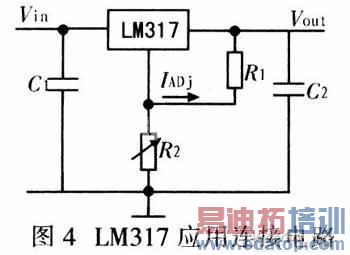 LM317是可调三端正电压稳压器,输出电压范嗣为1.2~37 V时能提供超过1.5 A的电流。此稳压器易于使用,只通过2个外部电阻设置输出电压。工作时,LM317建立并保持输出与调节端之间1.25 V的标称参考电压(Vref),该参考电压由R1转换为编程电流,该电流经R2到地,如图4所示。