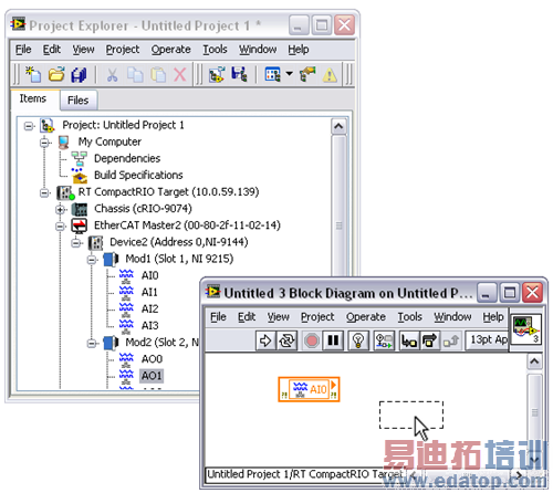 使用LabVIEW软件,用户可以轻易地将确定性扩展I/O集成到图形化编程环境中。NI 9144的“箱外”经验包含了在NI主控器上安装NI工业级通信的EtherCAT驱动,这样LabVIEW就可以自动识别所有连接的从设备及设备模块。LabVIEW实时模块还提供了I/O变量,使用户可以使用简单的拖放即可快速访问物理的I/O值。使用I/O强制和在线测试面板,用户可以使用I/O变量来监测系统性能并进行高级的故障排除。需要了解I/O变量背后的LabVIEW技术,请访问下面的链接。