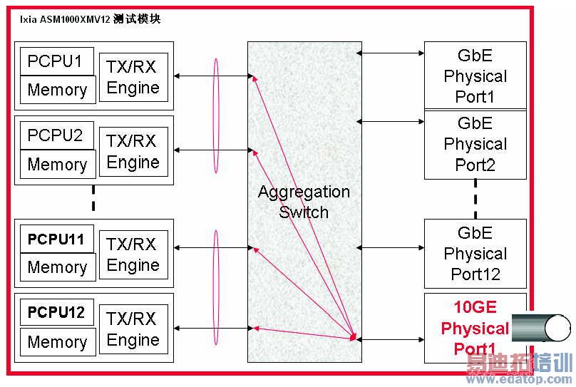 ●万兆聚合模式:将12个千兆口的PCPUs通过交换矩阵聚合到万兆端口上,产生10G应用层线速流量。这也是最典型最常用的应用模式,用于高性能10G防火墙、高性能应用网关和DPI等应用层设备的性能测试。图6是万兆聚合的示意。
