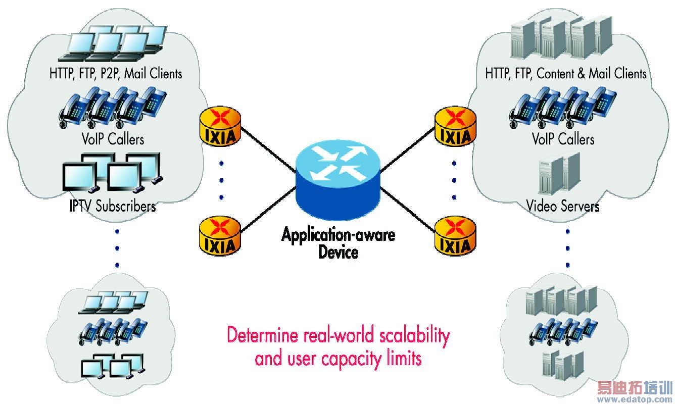 用户体验质量测试(QoE)是当前测试的热点之一,所有这些测试都要以实际业务仿真为基础,IXIA目前支持最为广泛的应用层协议(详细参见IxLoad产品介绍)。图8是业务性能测试示意,主要特点包括: