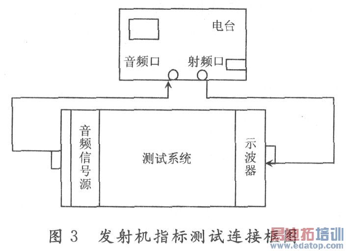 主要有发射机基本性能参数测试及发射机音频响应测试,测试框图如图3所示。