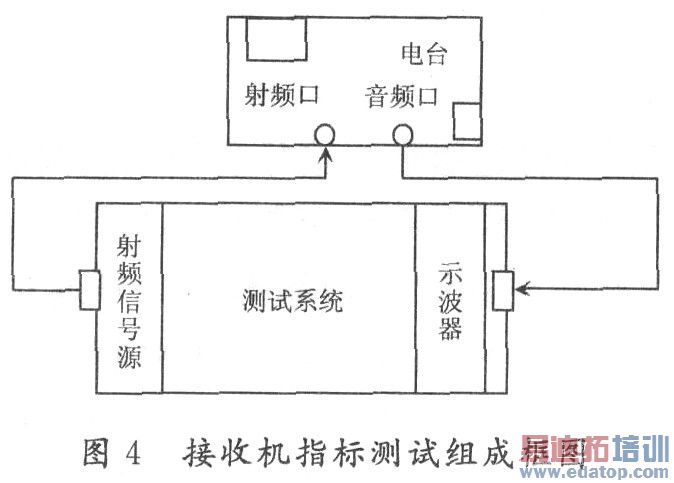 连接方法:将电台的音频输入端口和自动测试系统的音频输出用导线连接,将发射机输出信号端口和自动测试系统的示波器端口用导线连接。