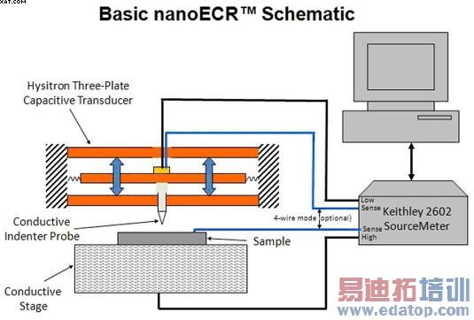 基于这些原因,Hysitron公司研制出了一套集成了Hysitron TriboIndenter™纳米机械测试仪和2602型双通道数字源表(俄亥俄州克里夫兰市,吉时利仪器公司产品)的系统。该系统还包括一个导电样本台、一个获专利授权的电容(nanoECR)转换器和一个导电硬度探针(如图1所示)。该转换器能够通过电流,无需给探针连接外部导线,从而最大限度地提高了测试精度和可重复性。这种“穿针”式测量结构确保了安全接触,有助于减少可能出错的来源。