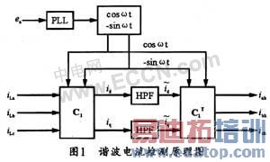 上述分析是只检测负载谐波电流的情况,如果需同时检测无功电流分量,则令式(1)中的iq=0即可。此外,对于三相电压不对称、电压波形畸变的系统,该方法仍然有效。在电流不对称时,对于三相三线制系统,上述方法也仍然有效;而对于三相四线制系统,则需要将零序分量从各电流中剔除,然后重复各步骤。该谐波检测方法的原理图如图1所示。其中PLL为锁相环,可用来产生与电源电压同步的标正余弦函数。
