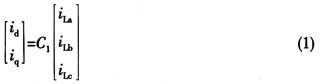 以三相电路瞬时无功功率理论为基础,采用同步旋转park变换的d-q的基本思想是将a-b-c坐标系下的电流量变换到d-q两相正交坐标系下来研究。设三相电压、电流是平衡且无零轴分量,那么,将三相负载电流iLa、iLb、iLc变换到d-q坐标系下,可得: