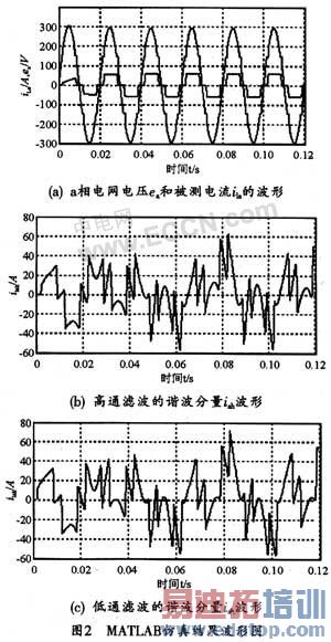 采用MATLA的SIMULINK软件进行仿真时,其检测电路模型可按照图1的原理进行搭建,模型的参数选择为:电源为工频220 V,电源支路上的,Rs=0.3Ω,Ls=0.3 mH;谐波源为三相整流桥电路的交流侧电流,直流侧接的电阻电感负载R1=8Ω,L1=80 mH。这种情况下,整流桥的交流侧电流可近似为方波。其仿真波形如图2所示。