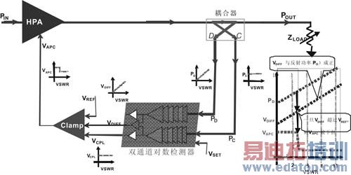 如图6所示,VSWR检测电路由一个定向耦合器、一个双通道对数检波器和一个箝位电路构成。HPA和负载之间的定向耦合器将入射波和反射波的采样结果耦合到耦合端口和反射端口,然后将其馈送到双通道对数检波器,如ADL5519或AD8302。在900 MHz频段具有30 dB耦合因子和大于15 dB方向性的定向耦合器使耦合信号和反射信号处于检波器的检测范围内。