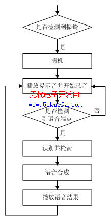 话路处理的主要任务是电话振铃检测,播放系统提示语音信息,接受用户的按键请求和语音请求,与后台数据库模块通讯,检索结果的语音合成和播放。整个模块有点类似于一个有限状态机,在程序设计时要跟踪系统所处的状态进行相应的动作,并进入下一个状态,其程序流程如图2所示。